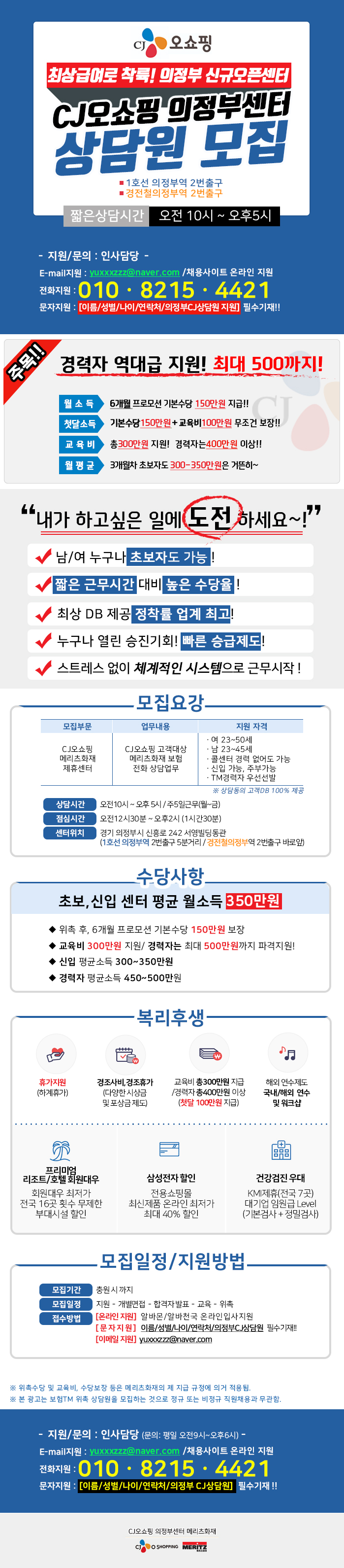 [의정부역]CJ오쇼핑 신규오픈센터 상담원모집