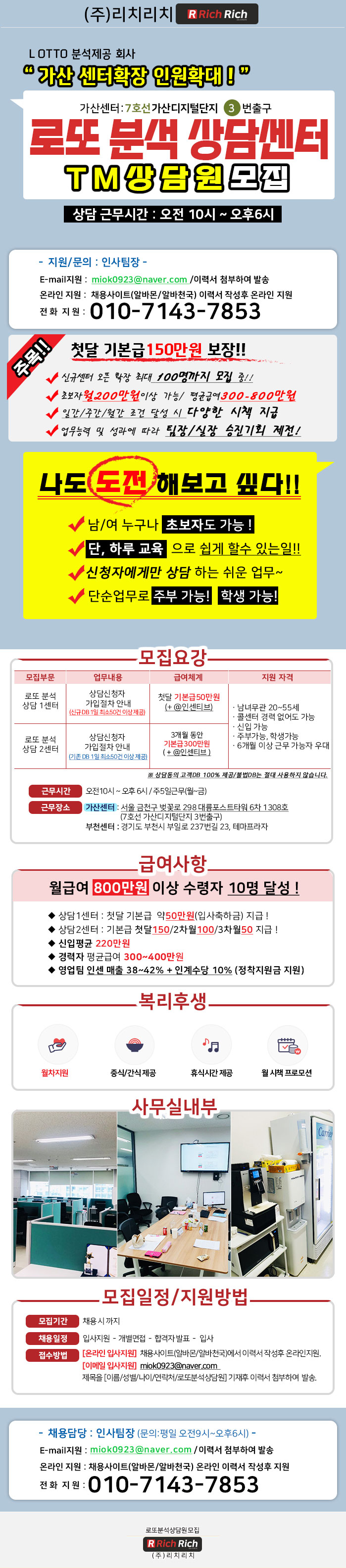 로또 분석회사/TM상담원 모집/리치리치/가산센터확장 이전글 다음글 목록 본문 로또 분석회사/TM상담원 모집/리치리치/가산센터확장 댓글목록 등록된 댓글이 없습니다. 이전글 다음글 목록