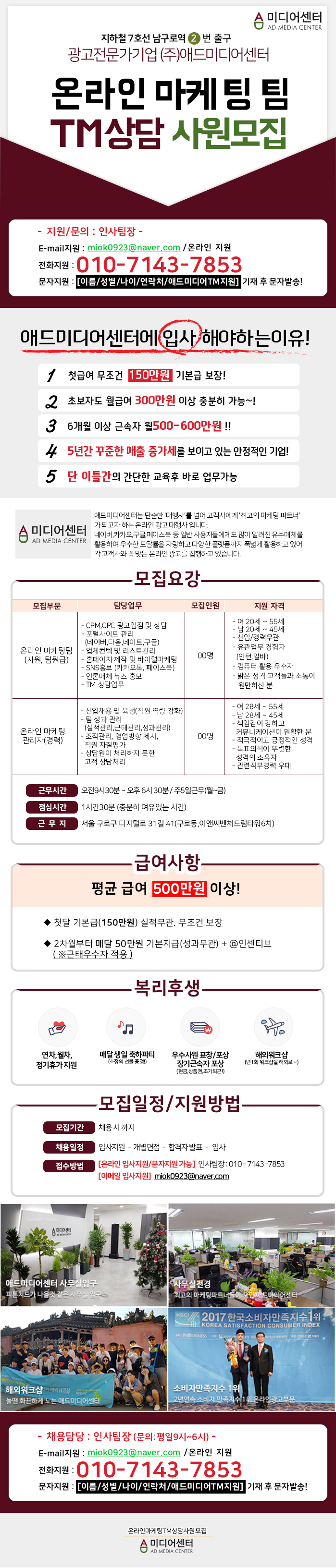 남구로역/본사 애드미디어센터/온라인TM상담원 모집(초보자 가능) > 전체채용