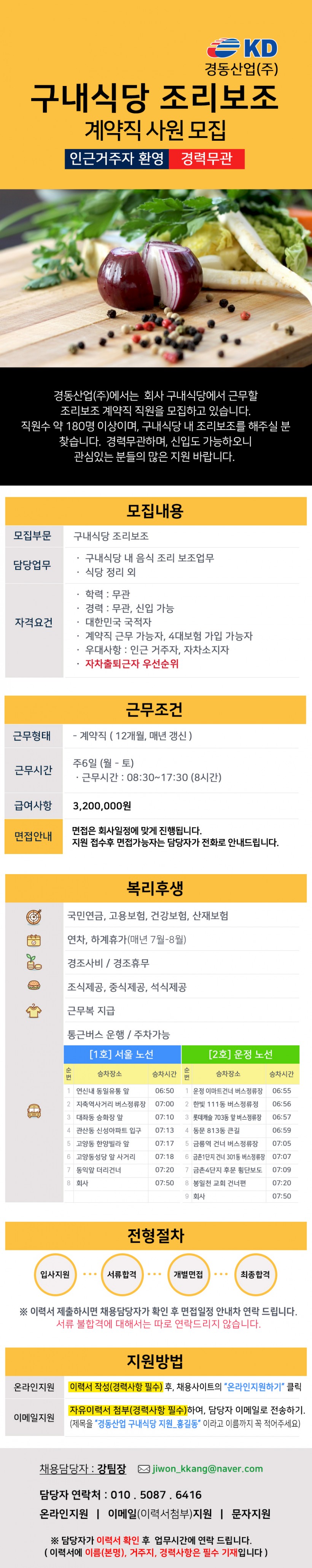 파주 경동산업 구내식당 조리보조 계약직 모집 2025.03.19 이전글 다음글 목록 본문 파주 경동산업 구내식당 조리보조 계약직 모집 2025.03.19 댓글목록 등록된 댓글이 없습니다. 이전글 다음글 목록