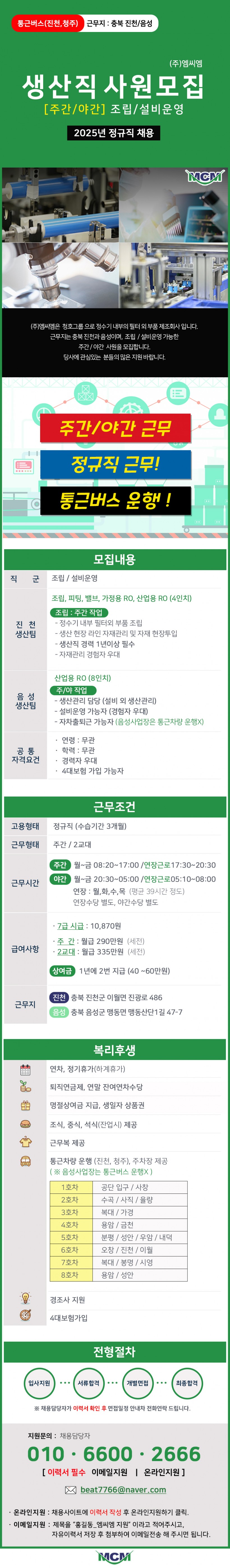 [진천,음성] 엠씨엠 생산직사원모집 2025.06.27 이전글 다음글 목록 본문 [진천,음성] 엠씨엠 생산직사원모집 2025.06.27 댓글목록 등록된 댓글이 없습니다. 이전글 다음글 목록